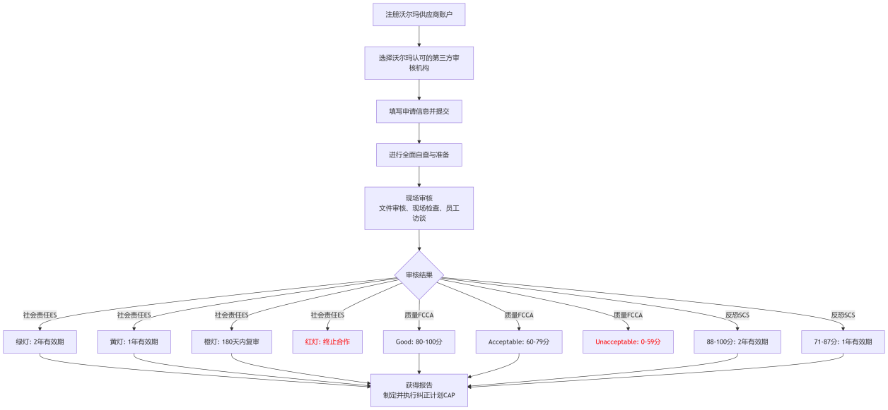 沃尔玛验厂的一般流程如下图所示,它涵盖了从注册到获得审核结果的各个环节: